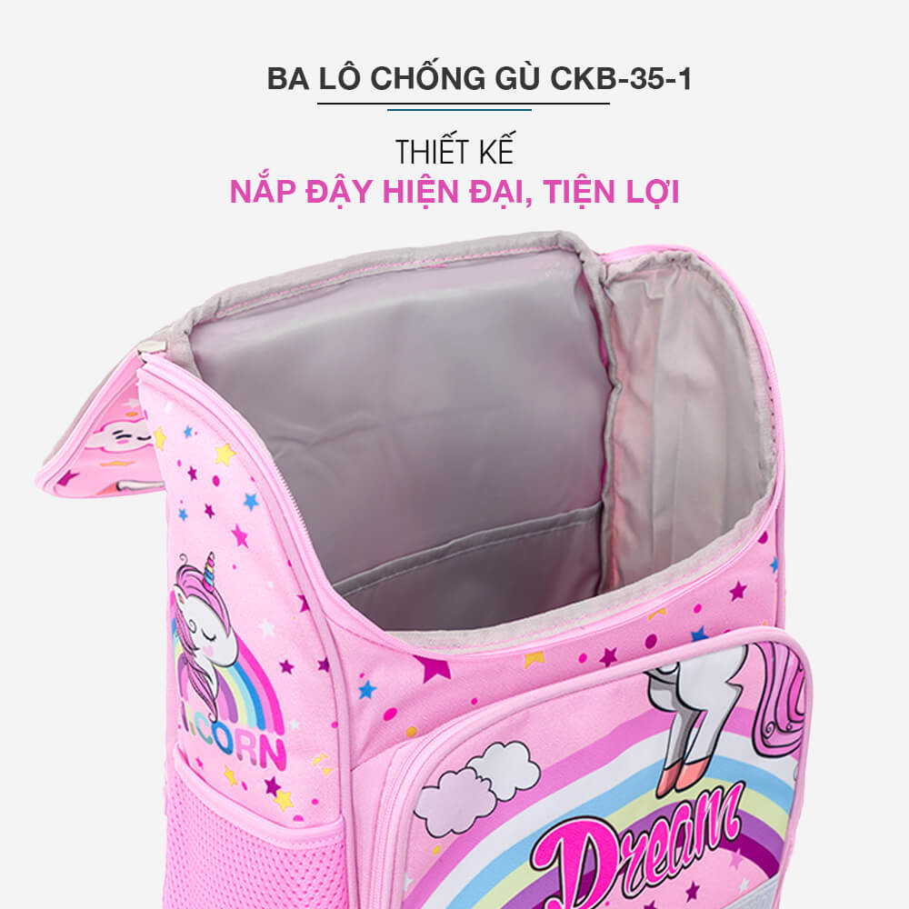 Ba Lô Chống Gù CKB_35_1 thiết kế dựa trên sở thích của trẻ nhỏ, sử dụng tạo hình là thú kỳ lân xinh xắn khơi gợi hứng thú và rèn luyện khả năng tư duy trừu tượng của bé.