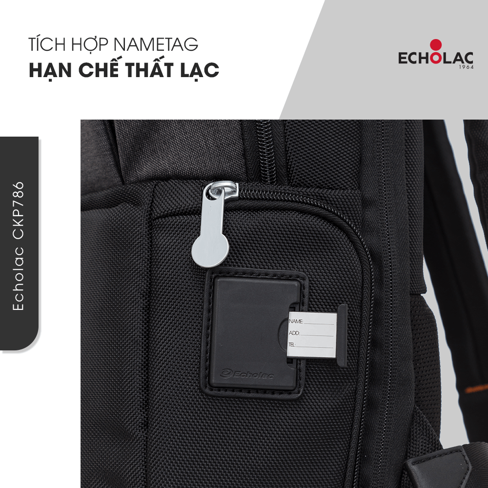 Balo laptop Echolac CKP786 có cạnh bên là ngăn phụ mini truy cập nhanh các món đồ dùng nhỏ thường dùng, phía trên ngăn phụ này có tích hợp khe chứa name tag hạn chế tình trạng thất lạc balo.