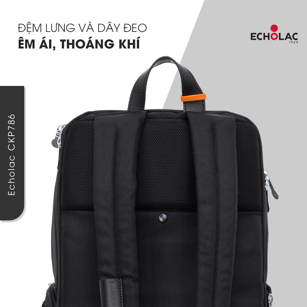 Chăm chút vào thiết kế nhằm đem lại trải nghiệm sử dụng tối ưu cho người dùng, balo laptop Echolac CKP786 tích hợp đệm lưới Airmesh mềm mại, đàn hồi và siêu thoáng khí, mang lại cảm giác mát mẻ, dễ chịu dù sử dụng balo trong khoảng thời gian dài. Đồng thời, phần dây đeo thiết kế thông minh, có thể thay đổi chiều dài phù hợp theo nhu cầu sử dụng, hỗ trợ làm giảm các tật về xương khớp như gù lưng hay lệch vai. Mặt khác, phần lưng balo cũng được tỉ mỉ kết hợp cùng đai cố định balo, dùng khi kết hợp cùng vali khi di chuyển trong các chuyến đi dài ngày.