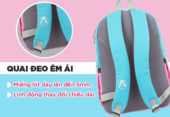 Với chi tiết quai đeo được thiết kế êm ái với miếng lót dày lên đến 5mm, linh động thay đổi chiều dài, mang lại cho người dùng cảm giác thoải mái. Đường chỉ may và khóa kéo chắc chắn giúp bạn yên tâm sự dụng mà không lo bị han rỉ hay đứt gãy. Đặc biệt, phần đệm lưng của sản phẩm AB5186 được thiết kế dạng đệm lưới Air Mesh êm ái, giúp cho bạn luôn được thông thoáng mỗi khi đeo, rất phù hợp với các bạn trẻ thường xuyên vận động trong thời gian dài.