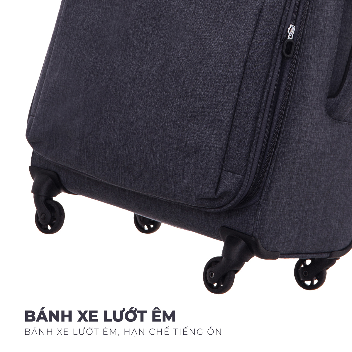 Vỏ bánh xe làm bằng cao su thiên nhiên đúc nguyên khối hạn chế ma sát với mặt đường, không gây tiếng ồn khi kéo vali trên sàn gỗ, bao quanh khung nhựa lõi cốt thép chắc chắn, chịu tải trọng lớn hơn nhiều lần so với trọng lượng sản phẩm.
