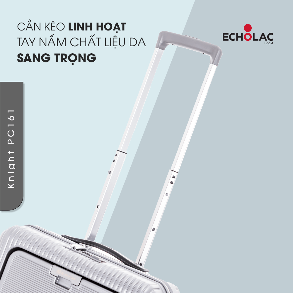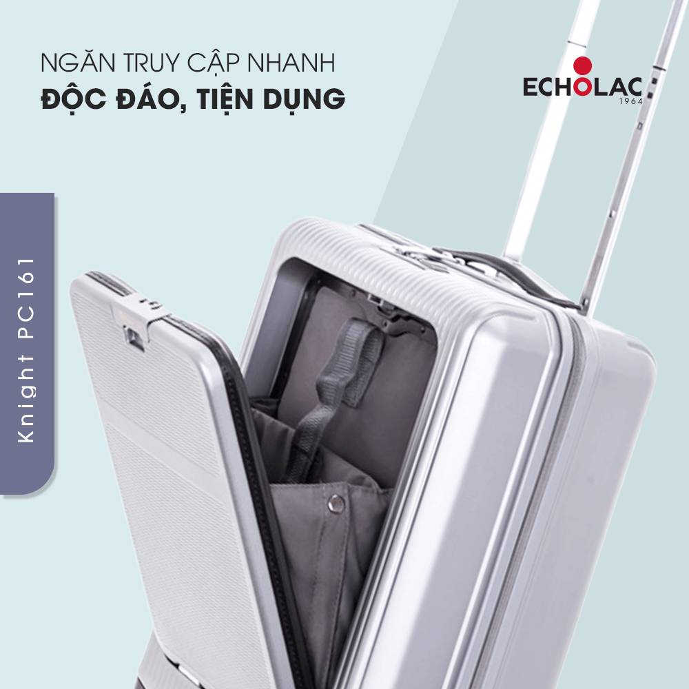 Vali Echolac Knight PC161 có thiết kế độc đáo với ngăn truy cập nhanh thiết kế dạng treo kết nối với thân vali bằng màn vải có nút bấm, mở nút bấm có thể mở rộng ngăn này để dễ dàng sắp xếp hành lý. Có thể sử dụng ngăn này để chứa những vật thường xuyên dùng chẳng hạn như máy tính, tài liệu hoặc sách báo..