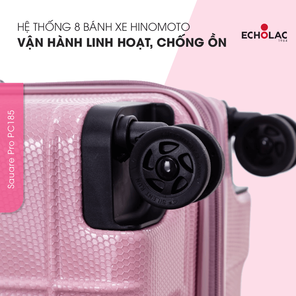 Nhà máy Hinomoto là nhà máy Nhật Bản sản xuất bánh xe oto lớn nhất thế giới. Chiếc vali du lịch Square Pro PC185 sở hữu 8 bánh xe Hinomoto kéo êm ái, di chuyển mượt mà, linh hoạt với khả năng xoay 360 độ. Vỏ bánh xe làm bằng cao su thiên nhiên đúc nguyên khối hạn chế ma sát với mặt đường, không gây tiếng ồn khi kéo vali trên sàn gỗ, bao quanh khung nhựa lõi cốt thép chắc chắn, chịu tải trọng lớn hơn nhiều lần so với trọng lượng sản phẩm.